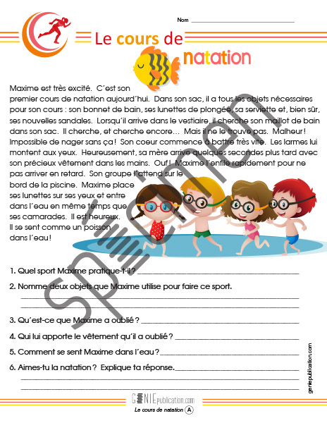 Compréhension de texte sur le thème d'un cours de natation.