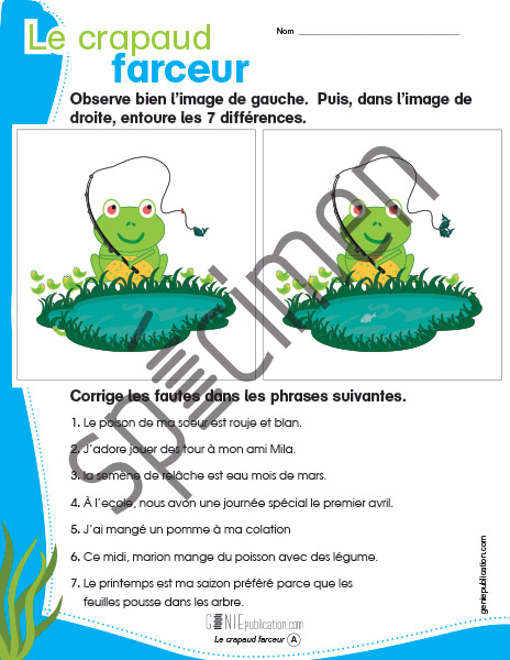 L'élève doit trouver des différences entre deux images. Il doit aussi corriger des fautes dans les phrases.