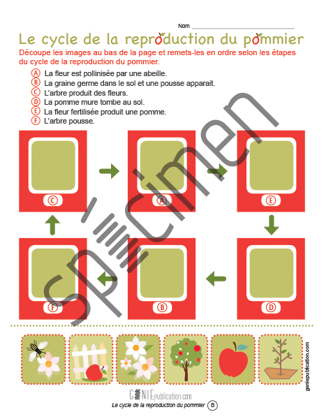 L'élève doit remettre en ordre les étapes du cycle de la reproduction du pommier.