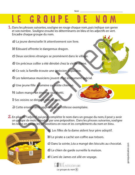 L'élève doit identifier les composantes du groupe du nom. 1 page d'exercices avec le corrigé. Comprend les pages en noir et blanc pour faciliter l'impression. Que représentent les lettres encerclées au bas de la page ?