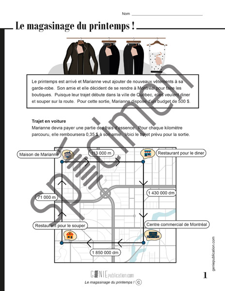 L’élève doit calculer les dépenses totales de Marianne, qui se rend à Montréal avec son amie pour leur magasinage du printemps. Il devra faire de la conversion de mesures (km, dm, m), des calculs de pourcentages et devra également respecter un budget.