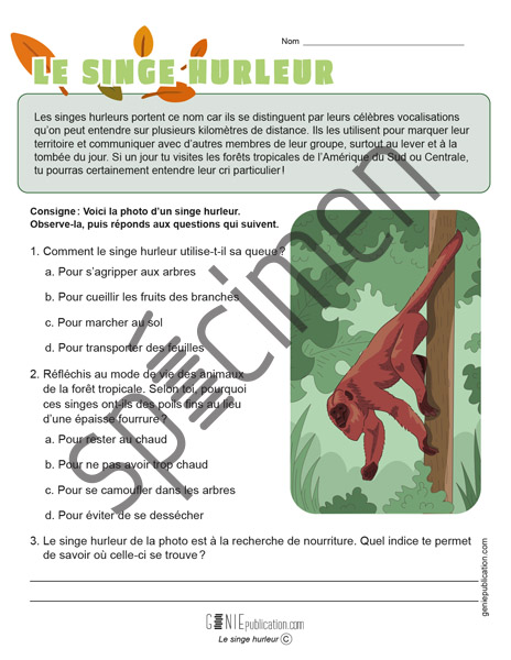 Dans cette activité, l’élève lit un court texte sur le singe hurleur (alouate) et il observe une image de ce singe. Ensuite, il répond à 3 questions à son sujet.