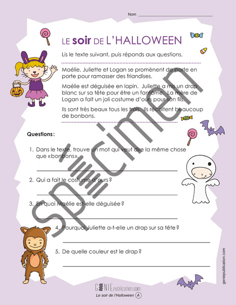 L'élève doit lire un texte sur le thème de l'Halloween, puis répondre à des questions.