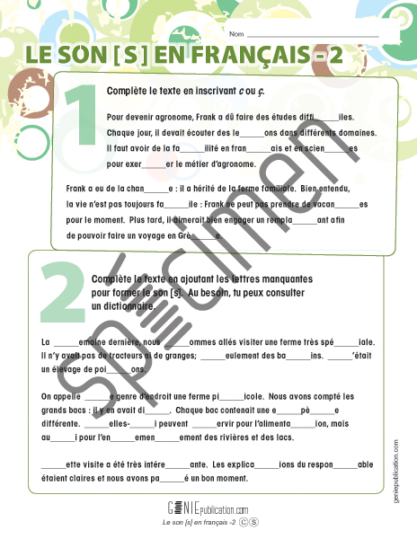 L'élève doit compléter deux courts textes en inscrivant les lettres appropriées pour former le son [s].