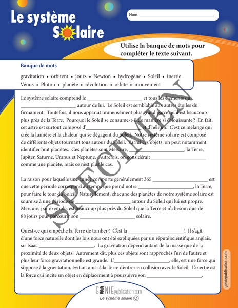 L'élève doit compléter un texte sur le système solaire à l'aide d'une banque de mots.