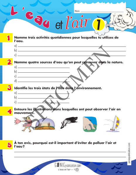 L'élève doit répondre à différentes questions au sujet de l'eau et de l'air.