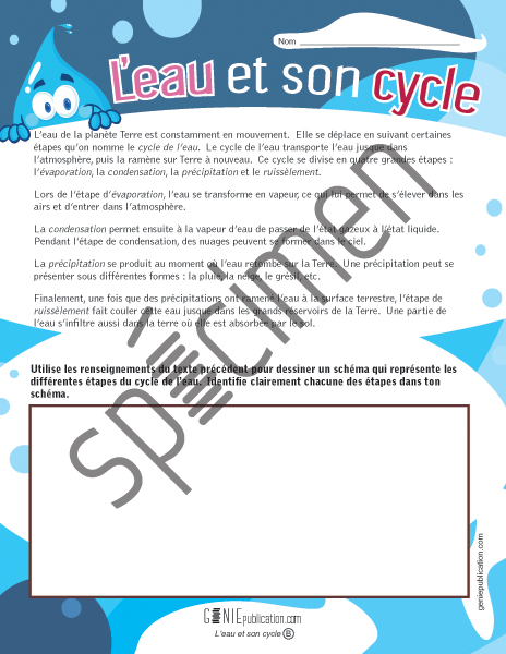 L'élève doit lire un texte à propos du cycle de l'eau, puis réaliser un schéma représentant les différentes étapes du cycle de l'eau.