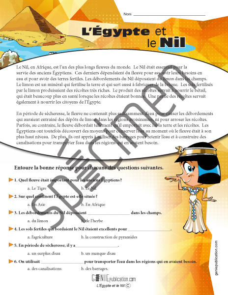 Après avoir lu un court texte au sujet de l'Égypte ancienne et du Nil, l'élève doit répondre à des questions à choix multiple.