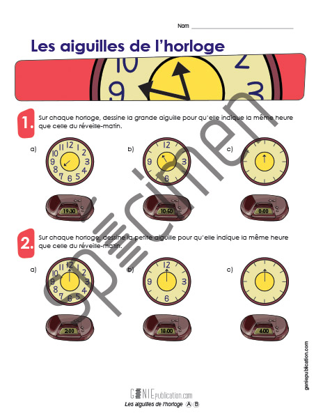 L'élève s'exerce à placer correctement l'aiguille des minutes ou des heures sur les horloges.