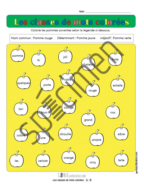 L'élève doit colorier les pommes selon la classe de mots auxquelles elles appartiennent.