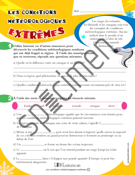 L'élève doit effectuer une recherche sur les phénomènes météorologiques extrêmes qui affectent sa région avant de répondre à des questions et de compléter des phrases à l'aide d'une banque de mots.
