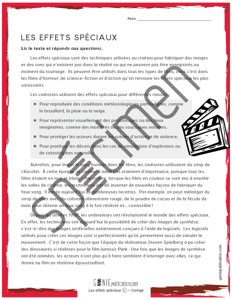 Après avoir lu un texte au sujet des effets spéciaux, l'élève doit répondre à des questions de compréhension et d'inférence.