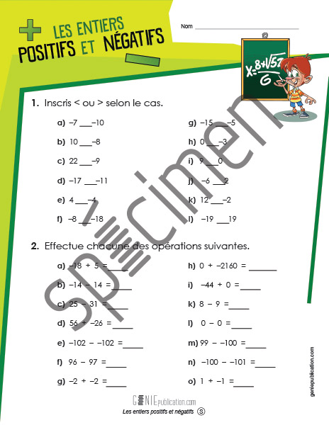 L'élève doit ordonner des nombres entiers positifs et négatifs. Il doit ensuite effectuer des opérations (additions et soustractions) d'entiers positifs et négatifs.