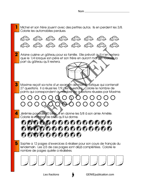 Dans cet exercice, l'élève est appelé à trouver des fractions équivalentes et à appliquer ses connaissances dans des situations de la vie quotidienne en représentant les fractions par des dessins.
