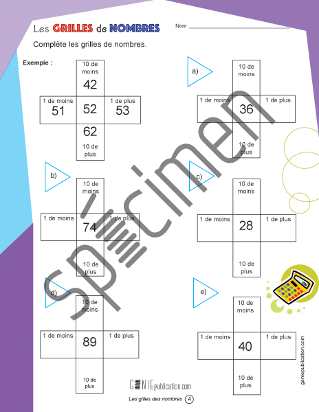 L'élève doit compléter des grilles de nombres en additionnant et en soustrayant des nombres à deux chiffres.