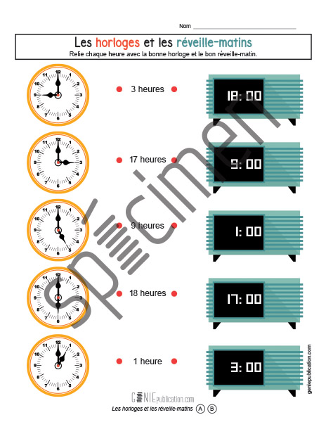 L'élève doit associer chaque heure à l'horloge et au réveille-matin correspondants.