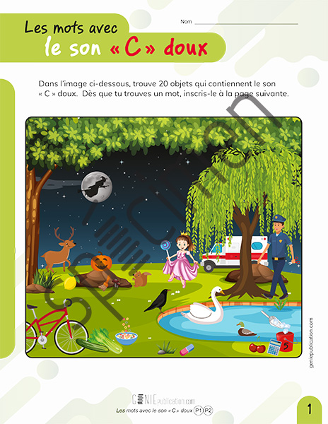 Dans cette activité, l’élève doit observer une image et y trouver 20 objets, chacun contenant le son « C » doux. Lorsqu’il a trouvé un mot, l’élève l’inscrit à la deuxième page.