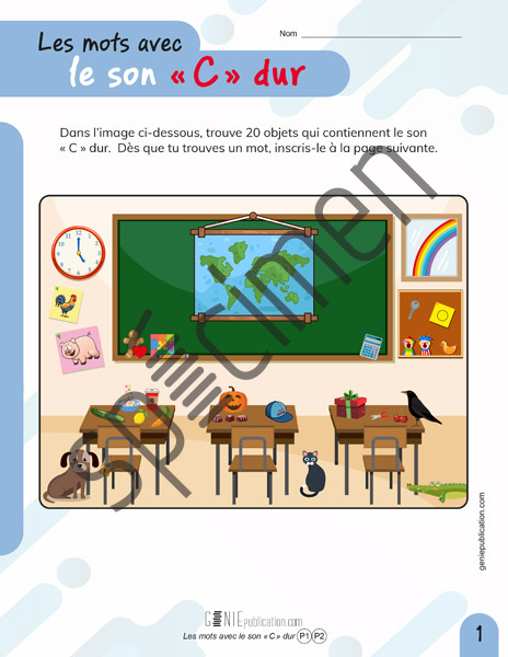 Dans cette activité, l’élève doit observer une image et y trouver 20 objets, chacun contenant le son « C » dur. Lorsqu’il a trouvé un mot, l’élève l’inscrit à la deuxième page.