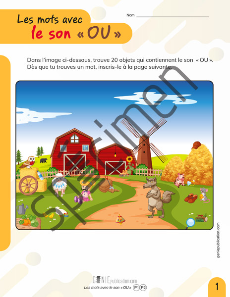Dans cette activité, l’élève doit observer une image et y trouver 20 objets, chacun contenant le son « OU ». Lorsqu’il a trouvé un mot, l’élève l’inscrit à la deuxième page.