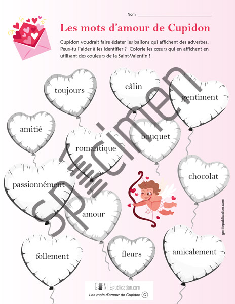 Dans cette activité sous le thème de la Saint-Valentin, l’élève colorie les ballons qui contiennent des adverbes en utilisant des couleurs liées à cette fête.