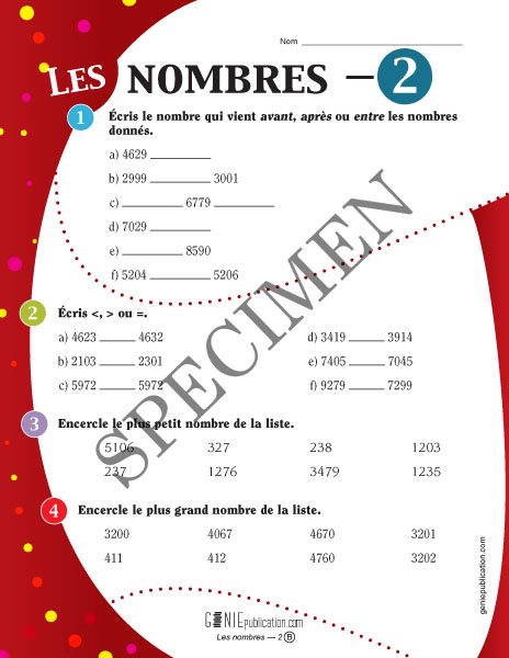 L'élève doit compléter des suites de nombres, utiliser correctement les symboles d'égalité ou d'inégalité (<, > et =) et repérer le plus petit nombre et le plus grand nombre dans des listes.