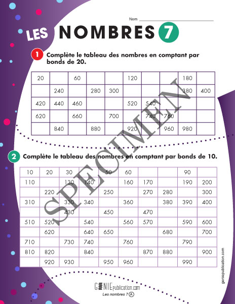 L'élève doit compléter des tableaux de nombres en comptant par bonds de 10 et de 20.