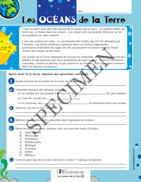 Après avoir lu un court texte au sujet des océans de la Terre, l'élève doit répondre à des questions de compréhension.