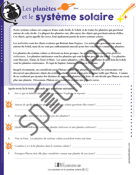 Après avoir lu un texte au sujet du système solaire, l'élève doit répondre à des questions de compréhension.