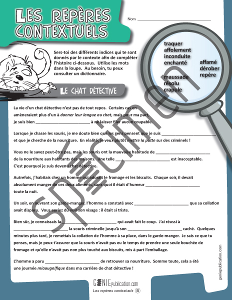 En s'aidant du contexte, l'élève doit compléter un court texte narratif en inscrivant les mots de l'encadré aux endroits appropriés.