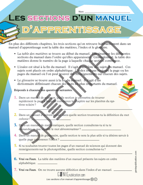 L'élève doit répondre à des questions au sujet de l'utilisation de la table des matières, de l'index et du glossaire d'un manuel d'apprentissage.