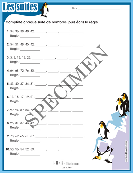 Dans cette activité, l'élève doit compléter des suites de nombres et trouver la règle de chacune d'elles.