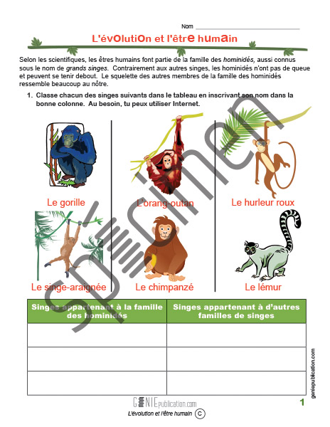 L'élève doit compléter des tableaux afin d'établir les ressemblances et les différences entre l'être humain et les autres membres de la famille des hominidés.