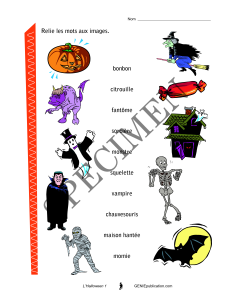 Dans le cadre de l’apprentissage de la lecture, l’élève de première année est appelé à associer un mot et une image. Les mots proposés gravitent autour du thème de l’Halloween.