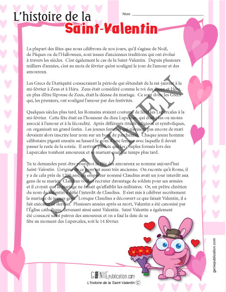 L'élève doit lire un texte informatif au sujet de la Saint-Valentin et répondre à différentes questions de repérage, d'inférence et de réaction.
