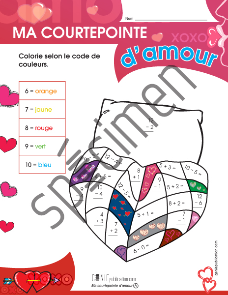 L'élève doit effectuer des additions et des soustractions afin de colorier l'image thématique de la Saint-Valentin selon le code de couleurs.
