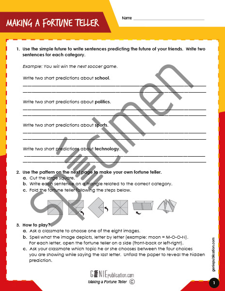 L'élève écrit des prédictions au futur simple. Il confectionne ensuite un jeu en origami dans lequel se retrouveront ses prédictions.