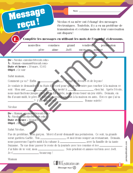 L'élève doit d'abord compléter deux messages en choississant les mots appropriés parmi ceux qui sont suggérés. Il doit ensuite identifier des verbes qui sont conjugués au conditionnel présent et au futur simple de l'indicatif et écrire ceux-ci à l'infinitif présent. Enfin, il doit répondre è des questions de compréhension de lecture.