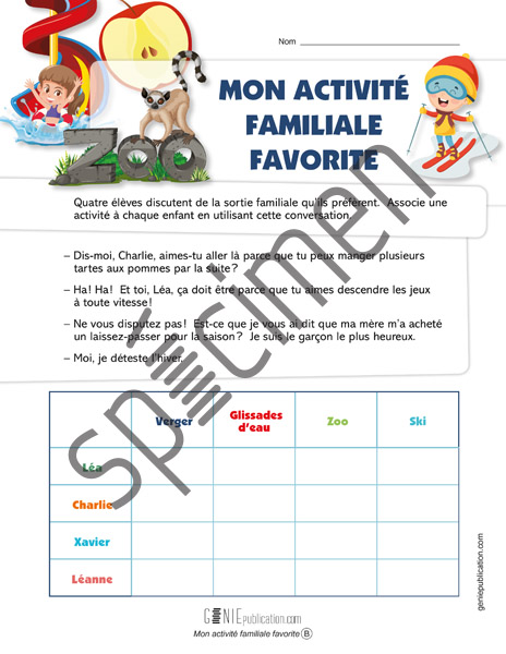 L'élève doit déterminer l'activité familiale préférée de chaque enfant selon les indices.