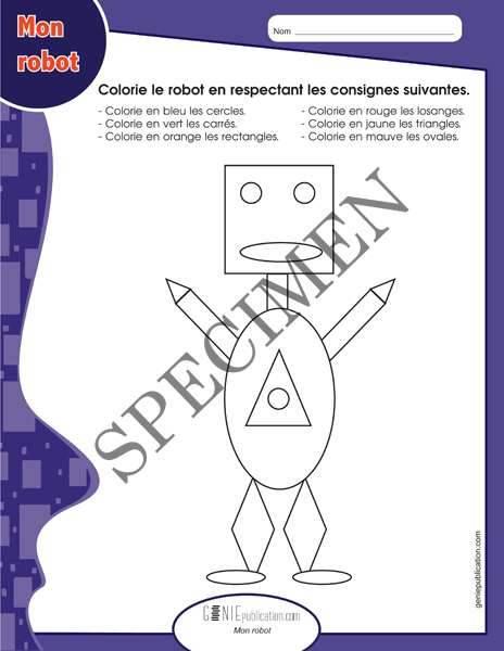 L'élève doit suivre les consignes pour colorier correctement les figures géométriques qui composent le corps du robot.
