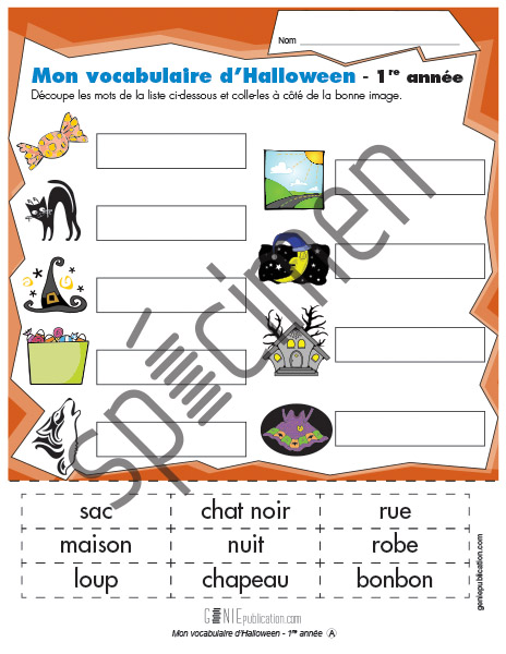 L'élève doit associer chaque mot de vocabulaire à l'image qui le représente. Les mots sont tirés de la liste orthographique du Ministère de l'éducation et de l'enseignement supérieur.