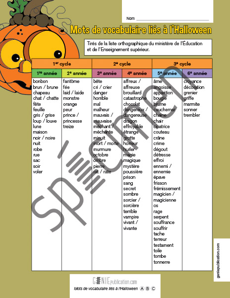 Ce document est une liste des mots de vocabulaire liés à l'Halloween pour chaque année du primaire. Il est tiré de la liste orthographique du Ministère de l'éducation et de l'enseignement supérieur.