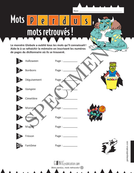 Dans cette activité sur le thème de l'Halloween, l'élève doit chercher certains mots dans le dictionnaire et inscrire les numéros de pages où ils se trouvent.