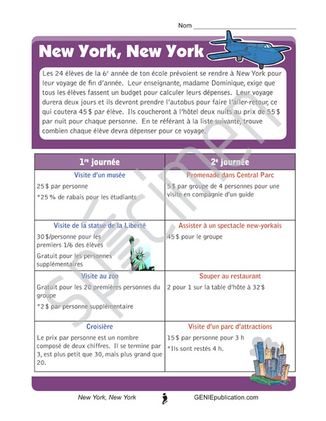 En décortiquant l'information qui se trouve dans ce problème, l'élève doit calculer le budget par personne nécessaire pour effectuer un voyage scolaire à New York.