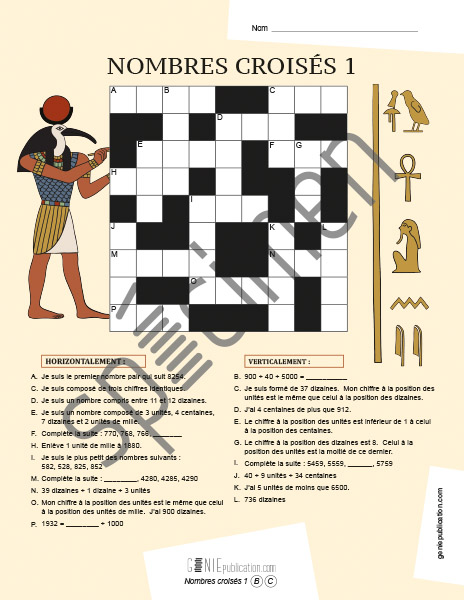 L'élève doit répondre aux questions en complétant la grille de Nombres croisés avec des nombres à 3 ou 4 chiffres.