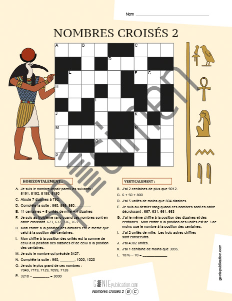 L'élève doit répondre aux questions en complétant la grille de Nombres croisés avec des nombres à 3 ou 4 chiffres.