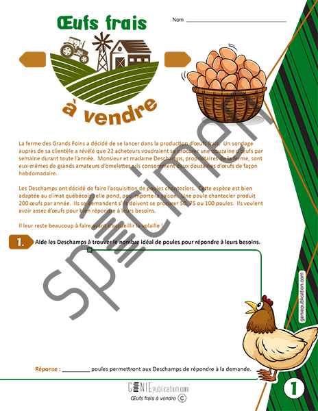 L’élève doit aider la famille Deschamps à préparer le terrain pour accueillir leurs poules. Il doit résoudre plusieurs problèmes et déterminer les couts engendrés ainsi que les profits de la vente des œufs.