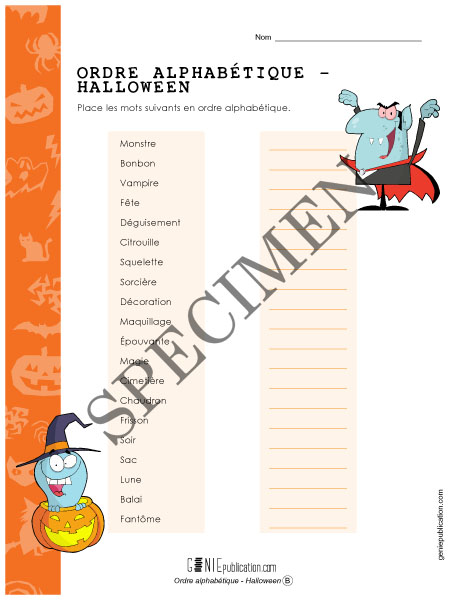 L'élève doit remettre en ordre alphabétique les mots d'une liste sur le thème de l'Halloween.