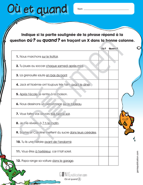 L'élève doit indiquer si la partie soulignée de chaque phrase répond à la question où ou quand.