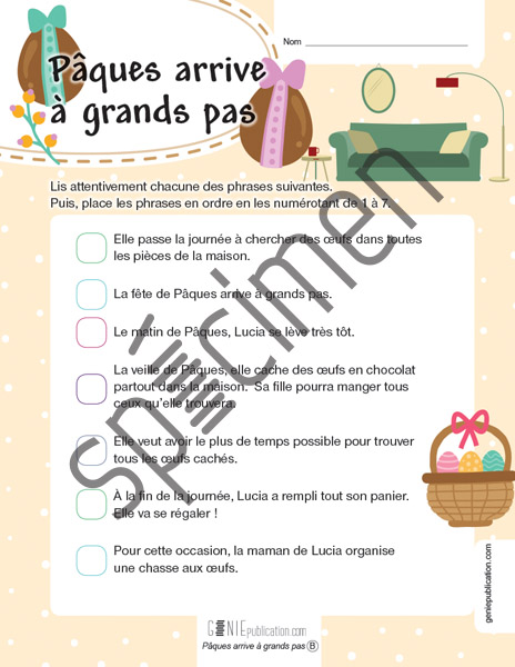L'élève doit lire des phrases et les remettre en ordre pour constituer une histoire cohérente.