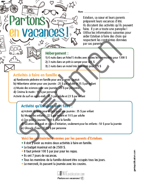 Il faut prévoir les vacances d'Esteban et sa famille en respectant des contraintes.